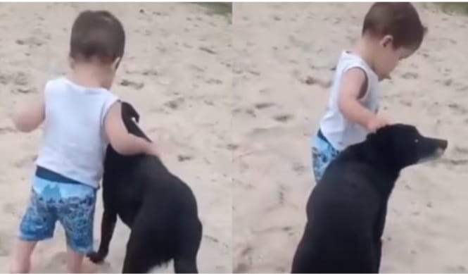 খুঁদে শিশু হাঁটা শিখছে এক পোষ্যর সাহায্যে
