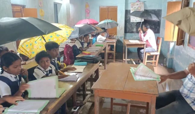 ছাতা মাথায় ক্লাসরুমে বসে ক্লাস করছিল হুগলির এক স্কুলের ছাত্র-ছাত্রীরা